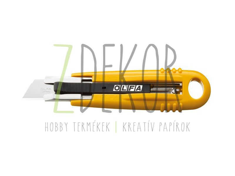 Rugóval szerelt biztonsági kés. A penge automatikusan visszaugrik a markolatba a vágás befejeztével.